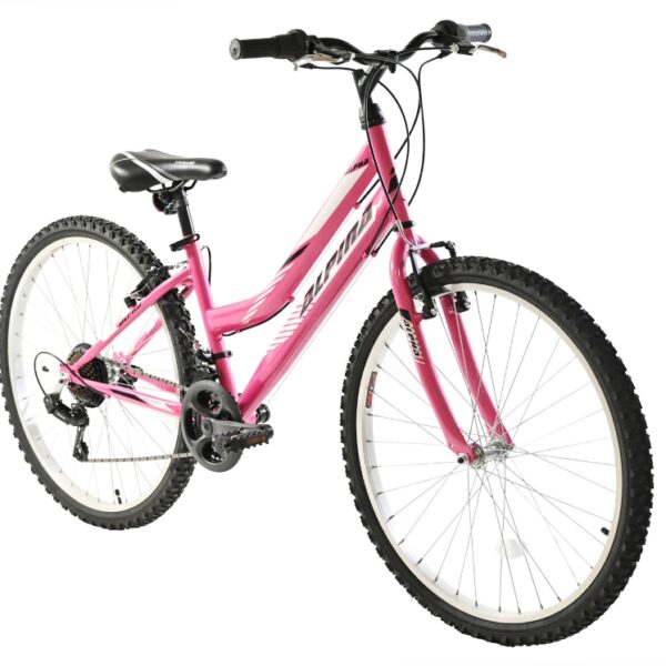 Το Alpina Alpha MTB 24'' είναι ένα ποδήλατο mountain, το οποίο μπορεί να κινηθεί σε όλα τα τερέν. Ιδανικό για κορίτσια ηλικίας 8+ ετών που θέλουν να εξερευνήσουν νέα μονοπάτια ή να κινηθούν σε πιο δύσβατες διαδρομές, καθώς μπορεί να αντέξει σε λακούβες και χωμάτινους δρόμους ενώ παράλληλα παρέχει άνεση. Τα ελαστικά του ποδηλάτου προσφέρουν την απαραίτητη πρόσφυση στο χώμα. Επίσης, διαθέτει σύστημα φρένων αλουμινίου V-Brake για αποτελεσματική επιβράδυνση και ασφάλεια.