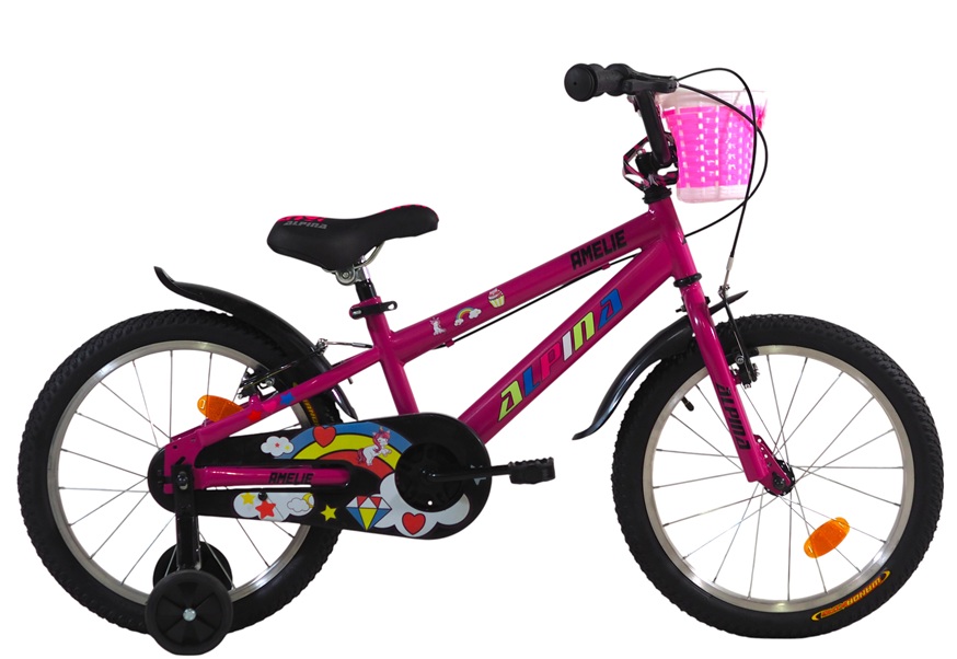 Παιδικό ποδήλατο Alpina 18'' Amelie για παιδιά ηλικίας 5-9 ετών (105-135εκ) με ενισχυμένες βοηθητικές ρόδες ώστε να νιώθουν περισσότερη άνεση και ασφάλεια καθώς αρχίζουν να μαθαίνουν ισορροπία. Ο έξυπνος σχεδιασμός του καθιστά ιδιαίτερα ευχάριστη τη διαδικασία εκμάθησης ποδηλάτου για τους μικρούς μας αναβάτες ενισχύοντας την αυτοπεποίθησή τους.